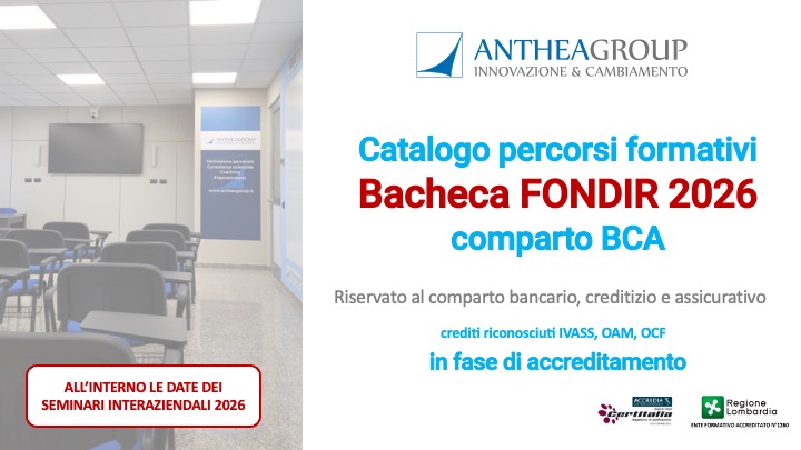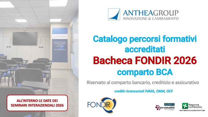 L’accreditamento di Anthea Group a Fondir nel settore bancario, creditizio e assicurativo, ci permette di supportare anche questo comparto. Anthea Group gestisce la progettazione e l’erogazione di percorsi formativi di Alta Formazione attingendo da un catalogo strutturato, oppure attraverso la presentazione di piani specifici e rispondenti a specifiche esigenze formative.